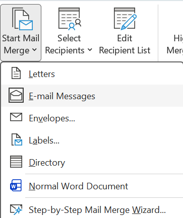 • Navigate to Mailings > Start Mail Merge > Email Messages.