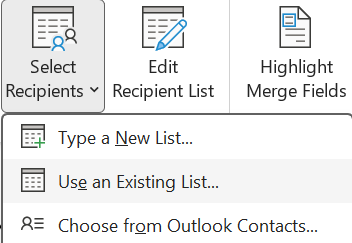 • Click Select Recipients > Use an Existing List, then choose your Excel file from Step 2.