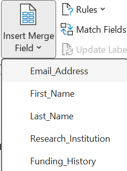 • Click Insert Merge Field and select the relevant fields (e.g., First Name, Institution, Research Focus).